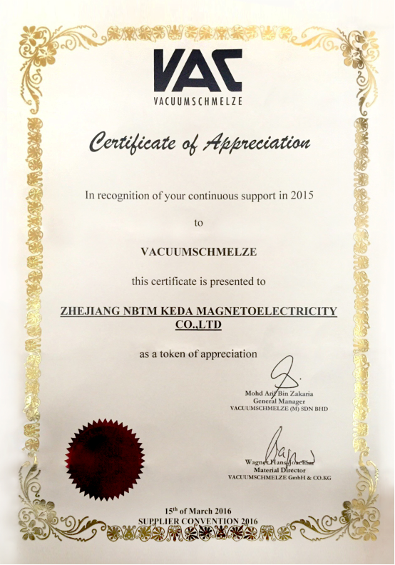 出席會(huì)議的除了VACUUMSCHMELZE(M) SDN BHD(馬來西亞)的總經(jīng)理,同時(shí)還有來自德國總公司及新加坡分公司的高層領(lǐng)導(dǎo)。VACUUMSCHMELZE(M) SDN BHD(馬來西亞)總經(jīng)理 Mohd Arif Bin Zakaria 發(fā)表致辭講話及頒獎(jiǎng)。東睦科達(dá)獲得了由Mohd Arif Bin Zakaria 頒發(fā)的感謝函,感謝東睦科達(dá)長久以來對他們的支持。對東睦科達(dá)來說,這樣的獎(jiǎng)勵(lì)無疑是很好的鼓勵(lì)。東睦科達(dá)將繼續(xù)為VACUUMSCHMELZE提供高質(zhì)量的產(chǎn)品以保持這種長期的友好的商業(yè)合作關(guān)系。