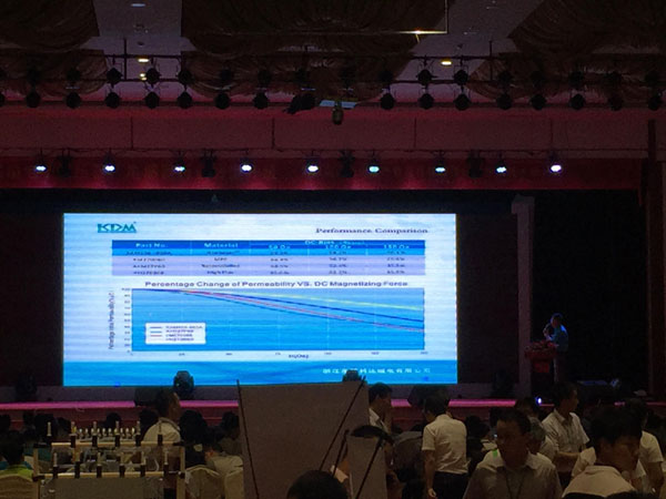 我司在現(xiàn)場(chǎng)進(jìn)行了產(chǎn)品展示,由我司新研發(fā)的超級(jí)鐵硅鋁磁粉芯,低成本硅鐵磁粉芯及納米金磁粉芯吸引了眾多專家工程師的濃厚興趣。做為演講嘉賓,Alan第二個(gè)出場(chǎng)發(fā)表了有關(guān)應(yīng)用于電源的新一代金屬磁粉芯的演講,得到了臺(tái)下觀眾的一致好評(píng)。